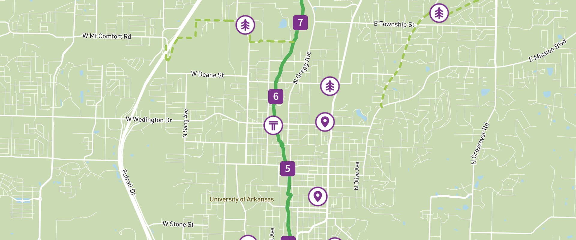 Developed an interactive web-based map for the Razorback Greenway, a 40-mile mixed-use trail spanning seven cities in Northwest Arkansas. The application serves as a digital complement to physical wayfinding signage, enabling community members to explore arts, culture, and entertainment opportunities along the trail.